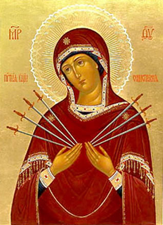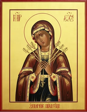 Vēsturisku ziņu par šo ikonu diemžēl nav, nav pat zināms, kur un kad tā parādījusies. Dievmāte tiek attēlota ar Viņas sirdī iedurtiem septiņiem zobeniem – pa trīs no abām pusēm un viens no apakšas.