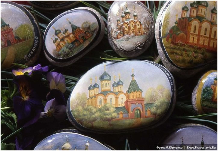 Māsu apgleznotie akmentiņi ar Pjuhticas klostera attēlu.