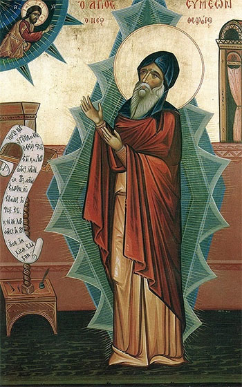Starp neskaitāmajām zvaigznēm, kuras iemirdzējās Baznīcas garīgajā debessjumā, tikai trīs svētie ir pagodināti ar Teologa[2] titulu: Kristus iemīļotais māceklis evaņģēlists Jānis [26. sept.], kurš, sēdēdams pie Kunga krūts, uzņēma Dieva Vārda izziņas dzīvo ūdeni; svētītājs[3] Gregorijs[4] [25. janv.], kurš, ar šķīstu iekšējo aci ieraudzīdams Svētās Trijādības noslēpumu, izskaidroja To, bruņojies ar labāko hellēņu daiļrunību; un, visbeidzot, sv. Simeons, kurš, iegremdēdamies Svētā Gara gaismā, bija Dieva sūtīts gluži kā jauns pravietis diezgan nodrošinātajā Bizantijas sabiedrībā ar tās formālistisko un oficiozo kristietību, lai liecinātu par to, ka katrs kristietis, kurš ir šī vārda cienīgs, ir aicināts Svētajā Garā apgaismoties un kļūt par Dieva dēlu[5].