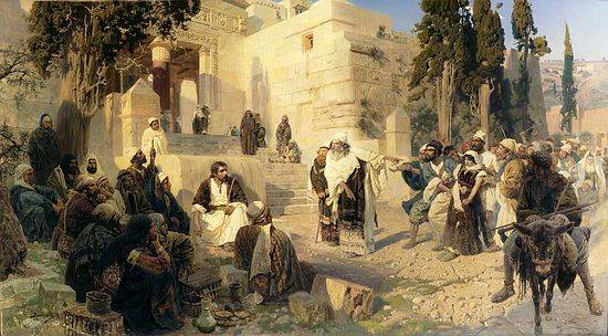 Kādu rītu labsirdīgais Kungs sēdēja Jeruzālemes tempļa priekšā un baroja daudzas alkstošās dvēseles ar Savu saldo mācību. Un visa tauta nāca pie Viņa (Jāņa Ev.8:2). Kungs teica tautai par mūžīgo prieku. Par taisnīgā mūžīgo prieku mūžīgajā debesu tēvzemē. Un tauta baudīja dievišķos vārdus kā ar medu. Un daudzu sarūgtināto rūgtums, daudzo sadusmoto dusmas, kusa, kā sniegs saulē. Un kas zina, cik ilgi turpinātos šis mīlestības dialogs starp zemi un debesīm, ja vien nenotiktu kaut kas negaidīts. Cilvēku mīlošais Mesija nenogura mācīt tautu, bet dievbijīgā tauta nenogurstoši klausījās dziedinošo un brīnumaino Gudrību.